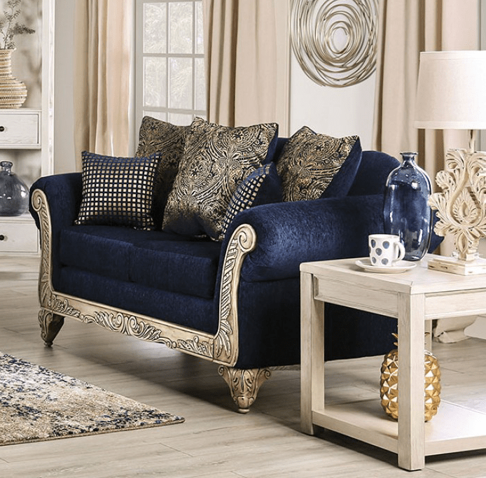 Indulge in the opulence of the Marinella Traditional Sofa, where classic artistry meets timeless comfort. Draped in lustrous blue chenille and framed by distressed natural ivory-finished wood, this piece embodies elegance from every angle. Intricate carved trim and upturned vintage feet add character and refinement, while plush high-density cushions ensure comfort worthy of its regal appearance. The Marinella is not just furniture—it's a statement of grace, heritage, and craftsmanship.