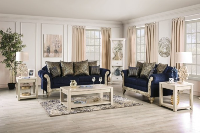 Marinella Traditional Sofa & Loveseat Set – Blue & Ivory