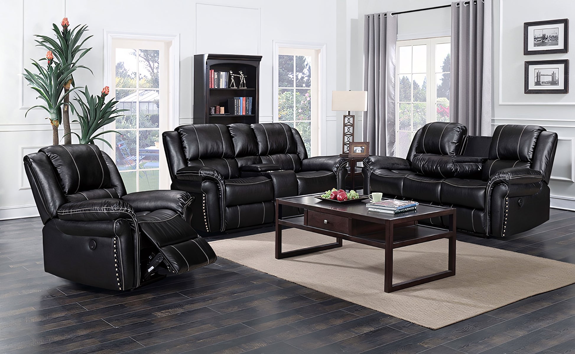 Elevate your living space with this sleek, all-black power recliner set, featuring sumptuous breathable air leather upholstery, bold thick stitching, and built-in USB ports. Crafted by Milton Green Stars (Model 8014-3PC), this set includes a reclining sofa, loveseat, and chair—with smooth power functionality, storage consoles, and a drop-down armrest for ultimate usability.