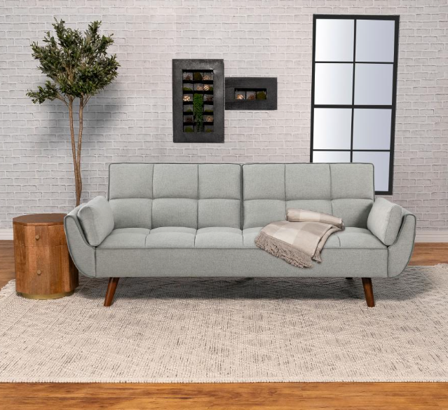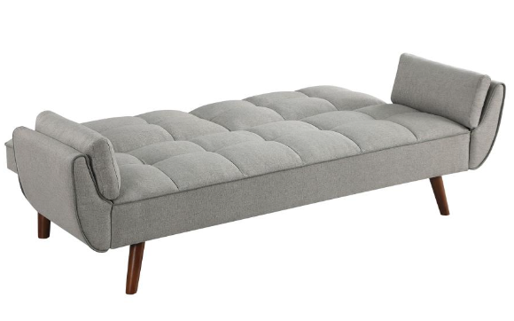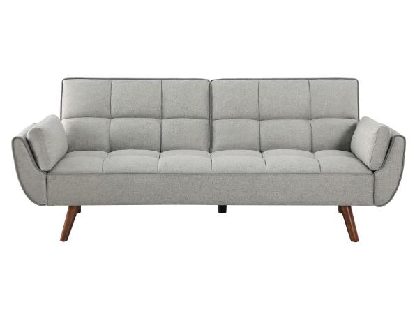 Add style and function to your living space with this multi-purpose sofa bed. Crafted with a kiln-dried hardwood frame, solid hardwood legs and a biscuit-tufted seat and back covered in grey woven fabric, this sofa offers superior stability and comfort. Accent pillows are included and are not removable.