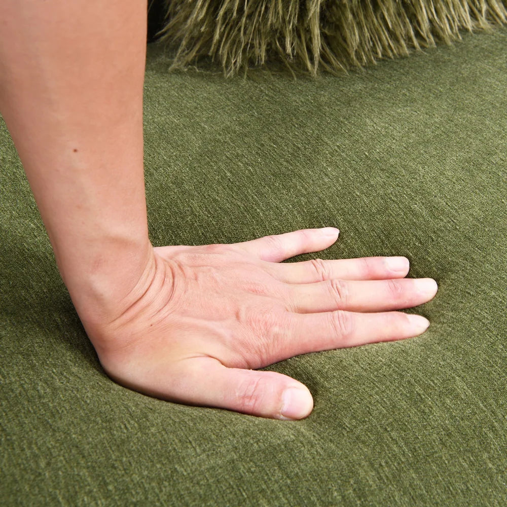 Mellone Mid-Century Modern Olive Green Chenille Sofa with Driftwood Base & Faux Fur Pillows – Furniture of America