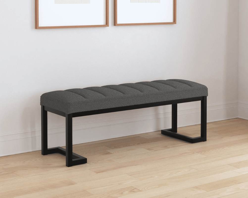 Textured upholstery play perfectly with the modern silhouette of a backless accent bench. Its deep black finish frame is constructed in metal for excellent durability, with a bracket inspired silhouette that emphasizes its contemporary design credentials. Thes eat is backless, with channel tufting that adds depth to plush foam cushioning. Upholstery is softly textured, perfect for a cozy feel in a modern living area or bedroom. Its neutral coloration is perfect for a variety of surrounding decor motifs.
