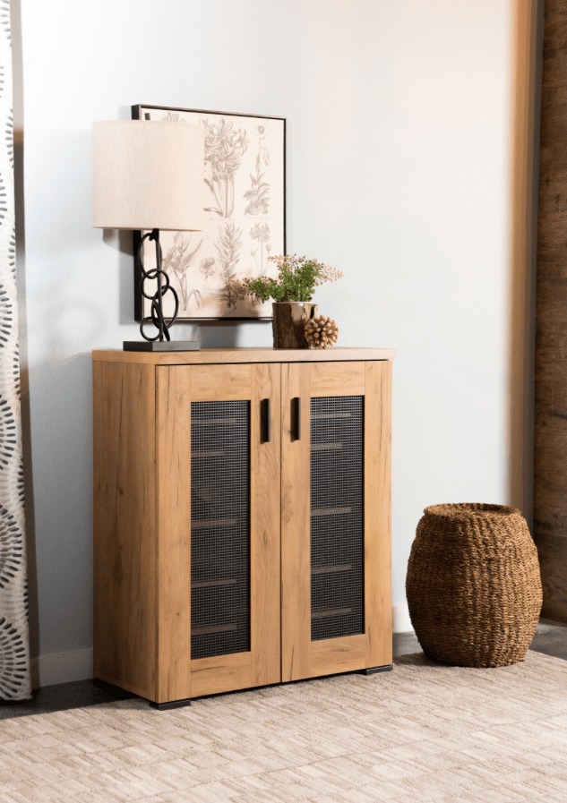 Organize your shoe collection inside this two-door rustic style shoe cabinet. The golden oak finish creates an attractive appeal in entryways and mudrooms. The gunmetal mesh door panels make for a striking contrast. Sleek bar pulls match the block style feet. Use this piece for your shoes or general storage needs.