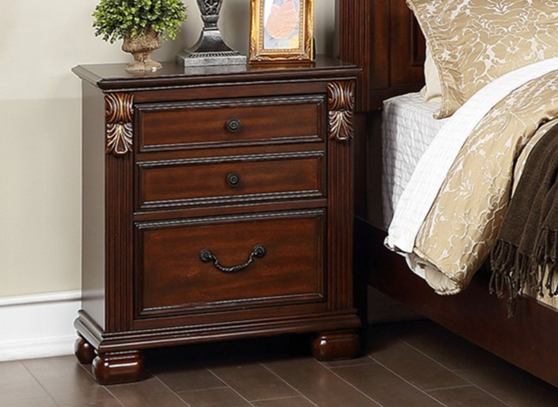 The Midland Traditional Nightstand brings timeless elegance and functional storage to your bedside. Crafted from solid wood with a rich dark cherry finish, this piece features three spacious drawers for keeping nighttime essentials close at hand. Ornate lion claw carvings and fluted accents echo the refined details of the Midland bed and case pieces, creating a cohesive and classic look for your bedroom.