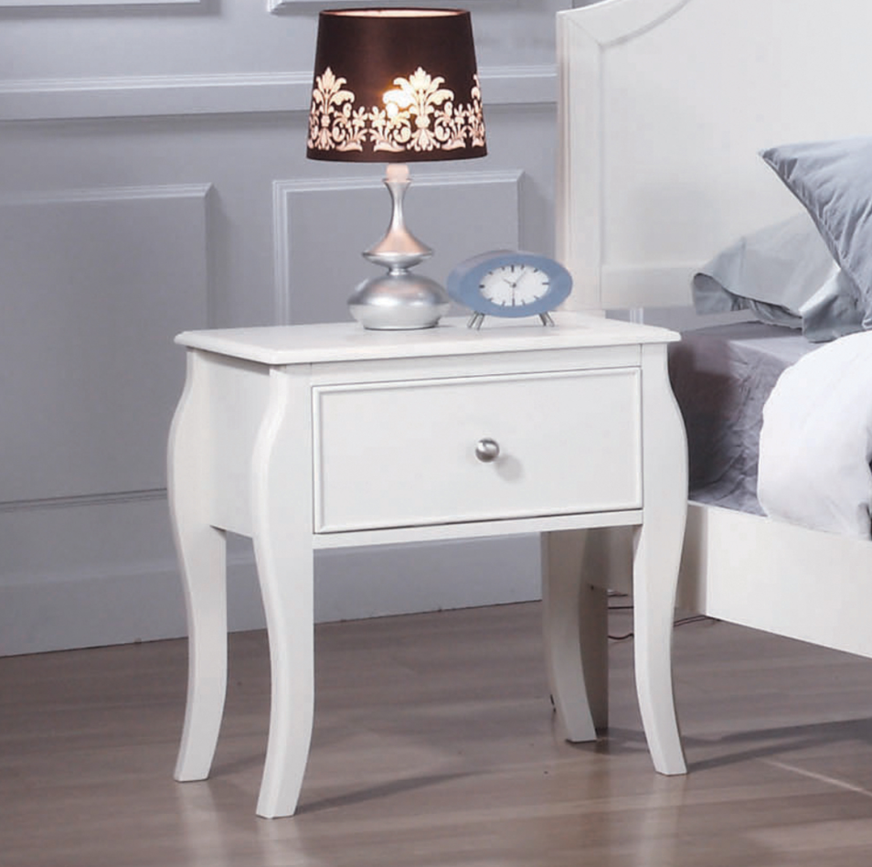 No bed is complete without a matching nightstand. This nightstand from the Dominique collection brings French country charm to your bedroom. It features a single drawer with silver metal knobs and a top that's perfect for a small decorative table lamp and an antique clock or vase. The curved legs impart a subtle grace to any bedroom. Expertly finished in splendid white for a contemporary look.