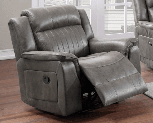 The Moore Motion Collection is available in dark coffee and slate blue leatherette. The collection features soft breathable leatherette upholstery on a solid pine wood frame with steel reclining mechanism.