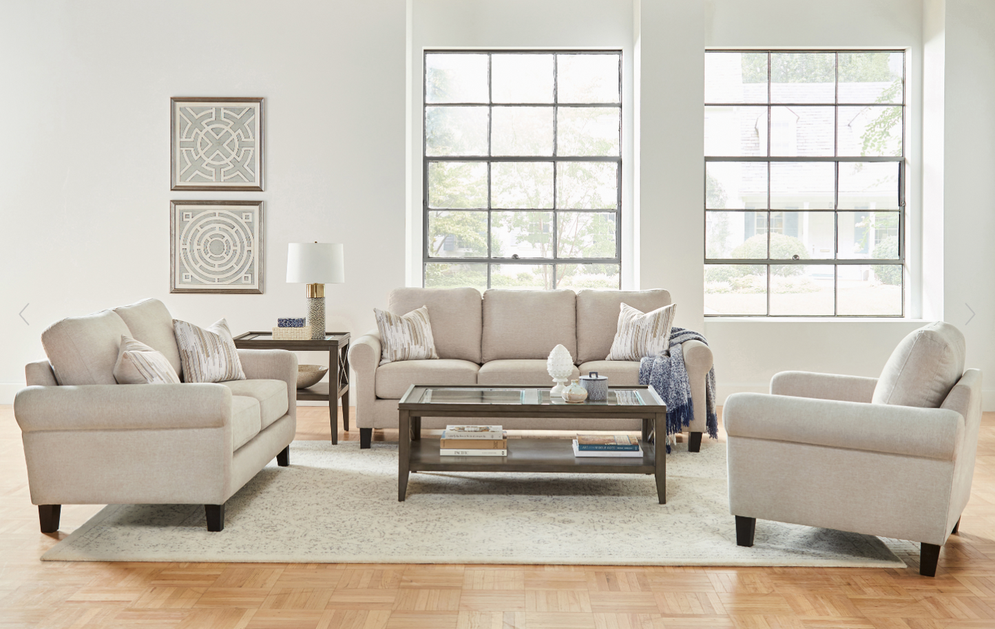Classical design elements add an elegant timeless touch to this transitional seating set. With traditional touches such as rolled arms and plush cushioned seats, this upholstered seating set invites you and the family to gather around and read or watch movies, spending time with one another. Upholstered in a neutral beige oatmeal chenille with champagne accents, this seating group matches existing color palettes effortlessly. Elevated by black tapered legs, there's even a subtle contrast that defines the silhouettes. Place this seating arrangement in a contemporary or traditional home for an understated classical flair.