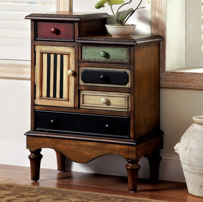 Pops of color stand out beautifully against the antique walnut finish. Multiple drawers and a compact cabinet ensure your accessories get stowed out of sight.