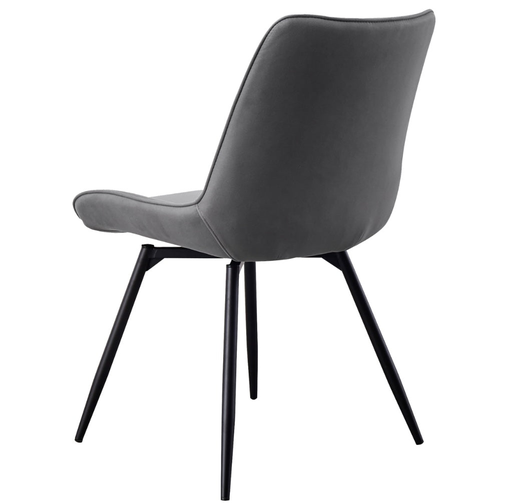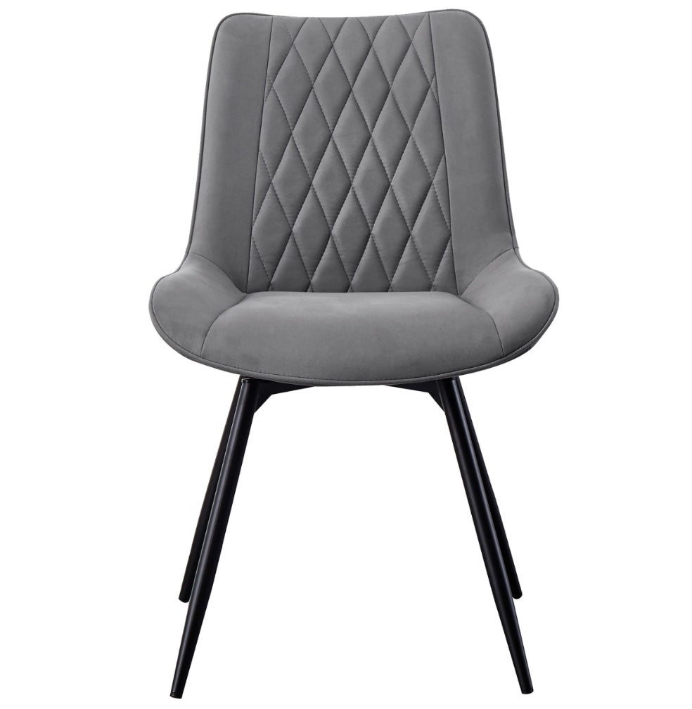 - Side chairs feature foam-padded seat, upholstered with soft gray fabric and quilting detail, swivel mechanisms, and round, tapered legs