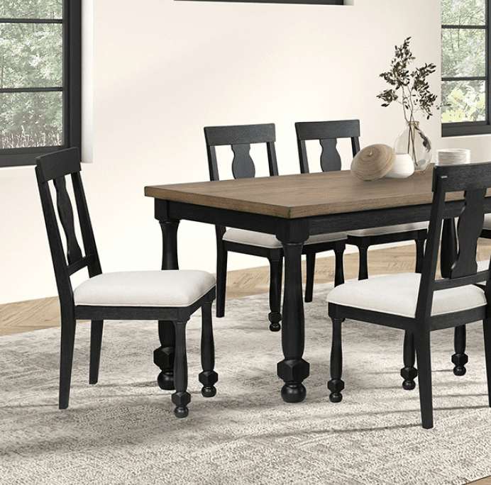 Experience the sleek and stylish design of the 7PC Modern Farmhouse Dining Set from Neue Mills, complete with a versatile 2-tone black and brown finish. Crafted with sturdy solid wood construction, the dining set features a smooth brown tabletop and farmhouse style black legs. The table is accompanied by 6 side chairs in black, with upholstered seats and matching farmhouse style legs for a cohesive look.