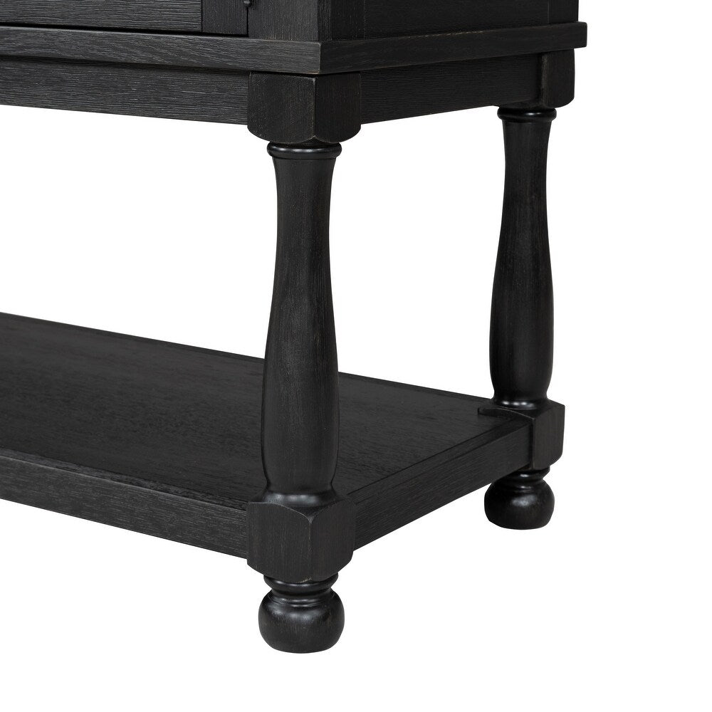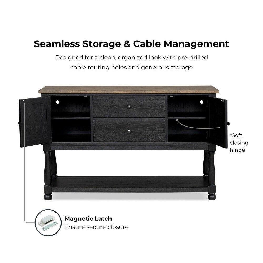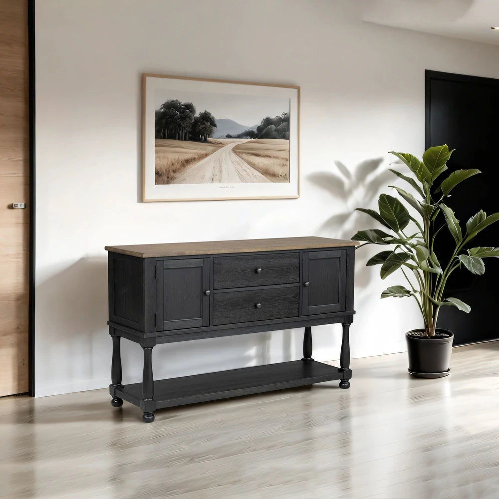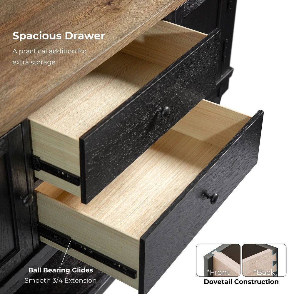 This dining server brings style and functionality to dining rooms or open kitchens. With two cabinets, two drawers, and an open shelf, it's perfect for organizing dining essentials or showcasing decor. The weathered finish and soft-close doors enhance its farmhouse appeal, making it a versatile piece for both storage and display.