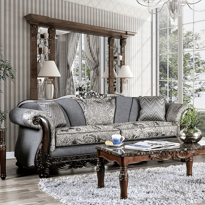 Newdale Traditional Sofa in Gray Chenille with Carved Wood Trim