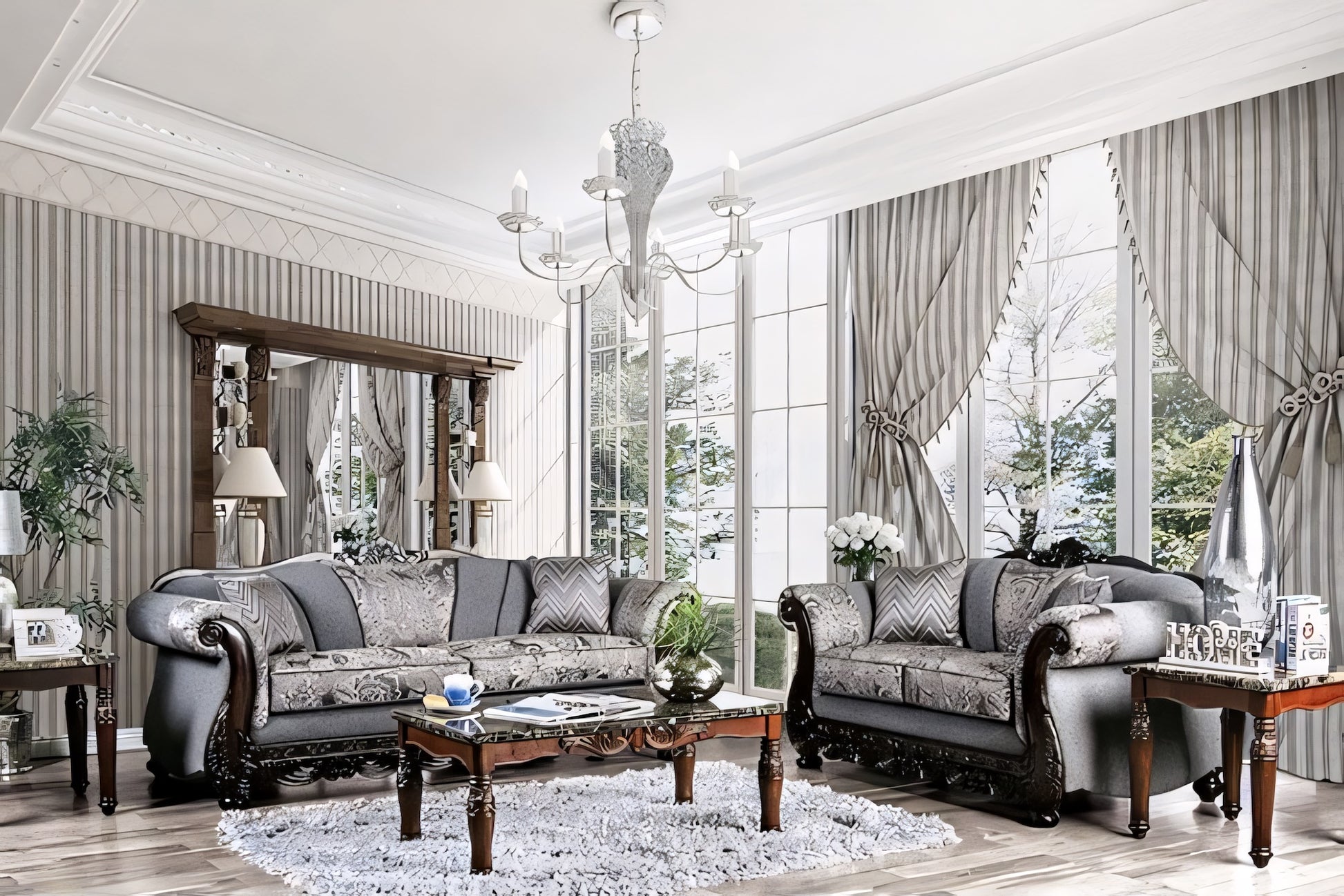 Ornate and regal, the Newdale Traditional Sofa in Gray Chenille brings dramatic elegance and classic romance to any living space. Intricate hand-carved wood trim frames its stately silhouette, while rolled arms and an arched camel back add refined curves that capture timeless charm. Upholstered in soft chenille fabric with patterned accent pillows, this piece delivers both comfort and sophistication — also available in Brown and Ivory finishes to match any décor.