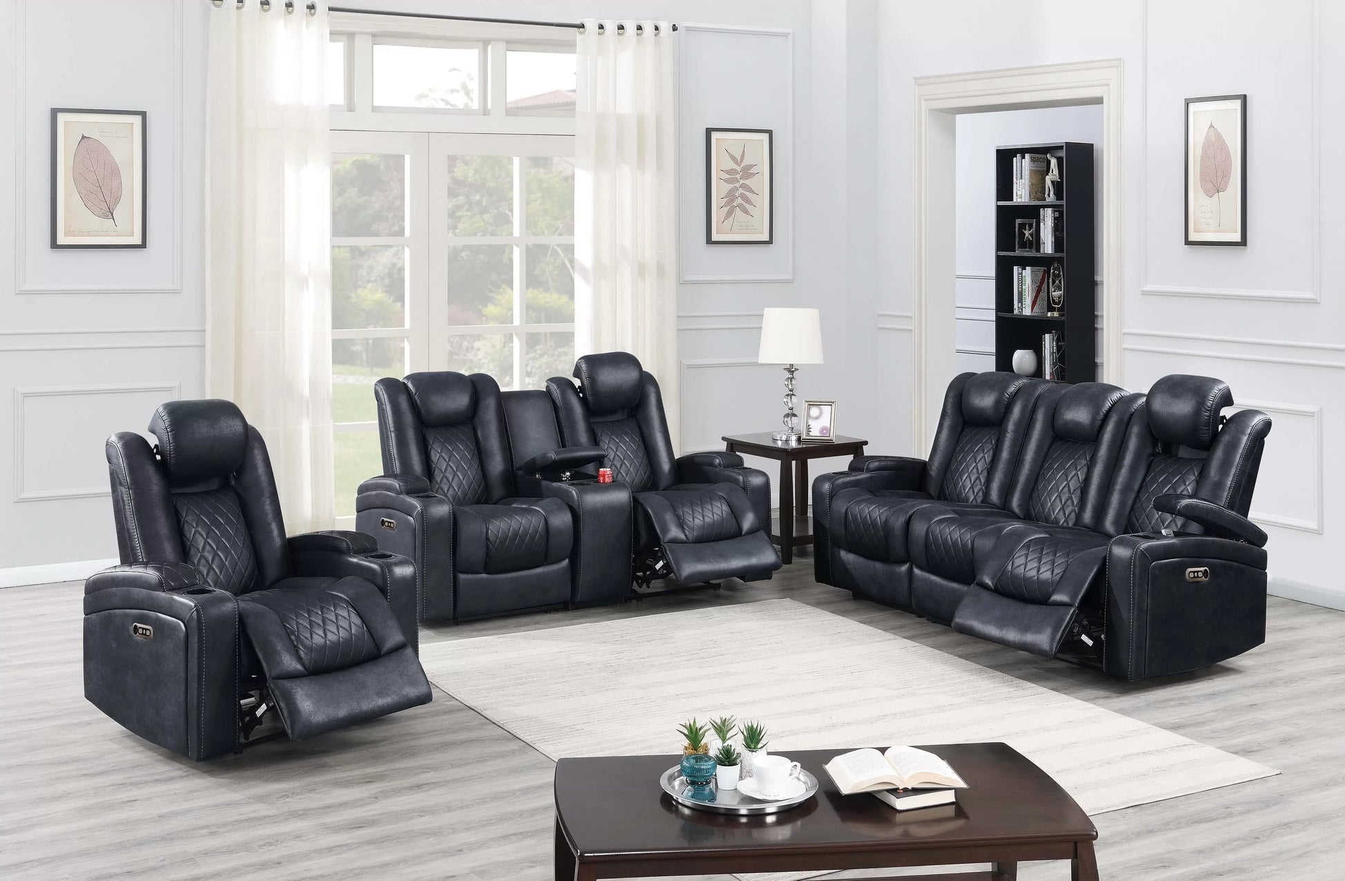 Discover the ultimate in comfort and convenience with the Pacific Power Reclining Collection. Upholstered in a sleek ink blue breathable leatherette, this sofa set offers modern style with advanced functionality. Each piece is engineered with a smooth power motion mechanism, built-in USB charging ports, and an adjustable headrest, so you can relax at the touch of a button. Extra storage and built-in cup holders make it perfect for everyday living and entertaining alike.
