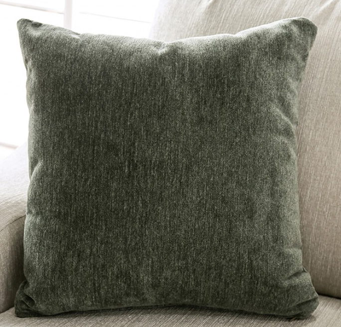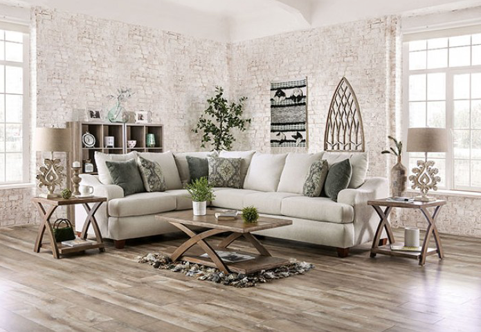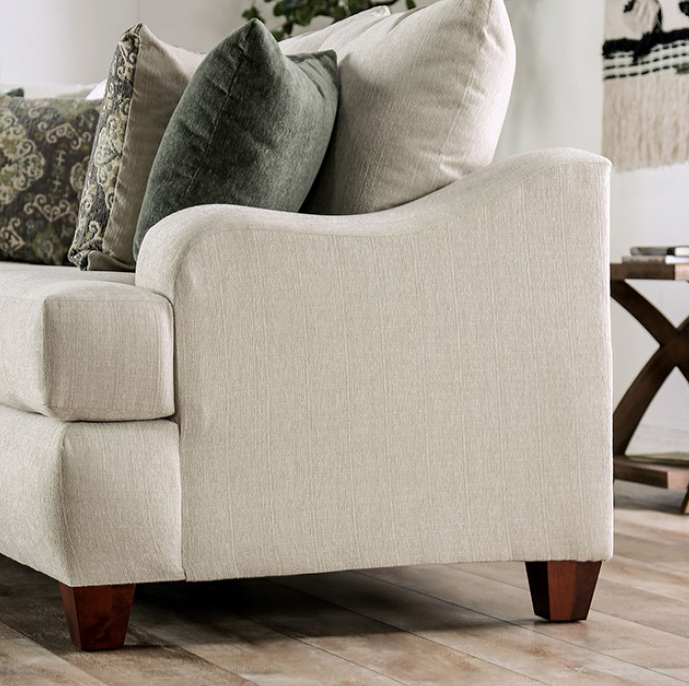 This dynamic sectional beautifully combines curved elements and an earthy palette to bring comfort to your home. The linen-like fabric is in a warm beige color while the accent pillows are in a greenish-gray sage hue. Offering a wonderful sense of roominess, the T-shaped seat cushions and low contoured arms make lounging and conversing with friends and family particularly more pleasant. This made in USA corner piece is a perfect match for any large living space.