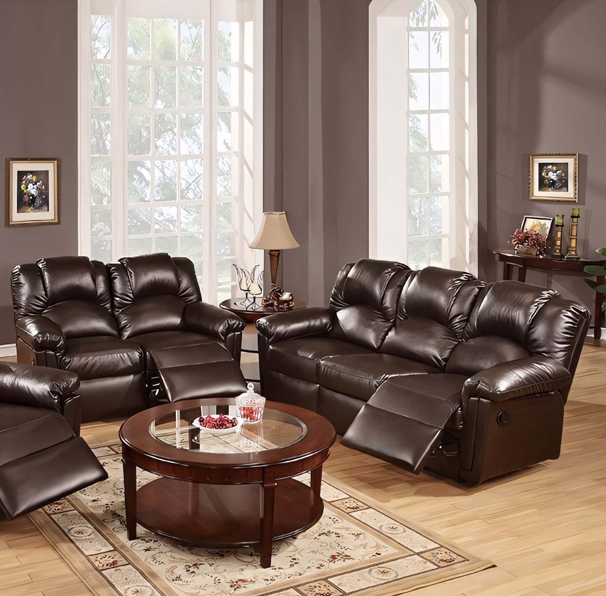 Settle into classic comfort with the Palmer Motion Collection—a manual reclining sofa & loveseat duo that pairs timeless styling with everyday durability. Upholstered in thick, plush bonded leather (your choice of Black or Brown), each piece features overstuffed pub-style backs and pillow arms for full-body support while you watch, read, or relax.