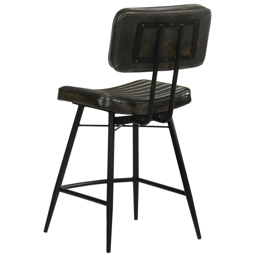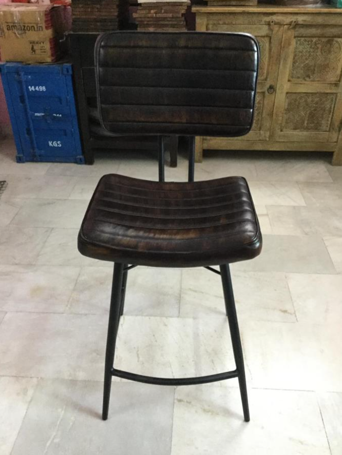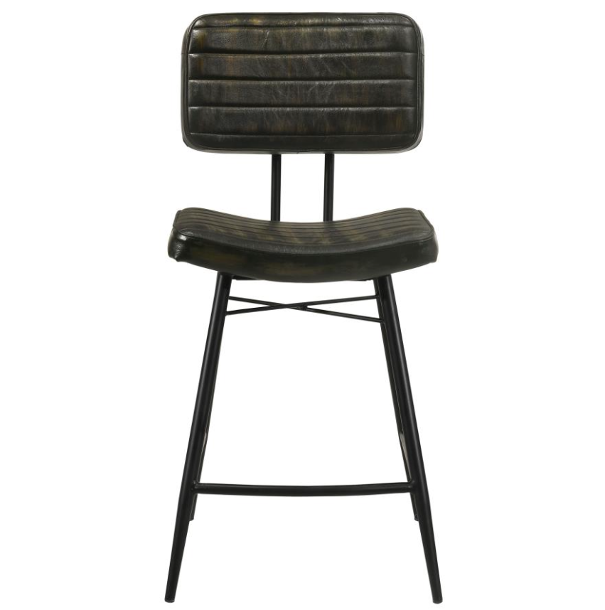 Add a retro-inspired touch to a space with this industrial-inspired counter height stool. Wrapped in a leather upholstery across the contoured backrest and seat, this stool offers ultimate comfort and stability. Each leather piece includes hand-dyed details, offering a lovely gradation and warmth and features channel tufting with welt trim details. Along the back is an iron X-shape back for extra support and a stylish accent. The comfy leather seat also rests on a black iron base designed with flared tapered legs that push the vintage vibes.