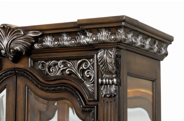 A rich dark brown finish enhances the ornate details, from the hand-carved corbels to the crown molding and intricate trim. Two glass doors open to reveal adjustable glass shelves, all beautifully illuminated with built-in touch-activated LED lighting that adds depth and ambiance to your display. A full-extension drawer at the base offers additional hidden storage, complete with smooth ball-bearing glides and felt-lined interiors for your most delicate items.
