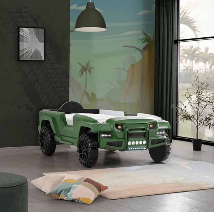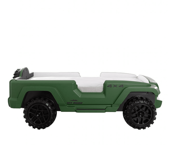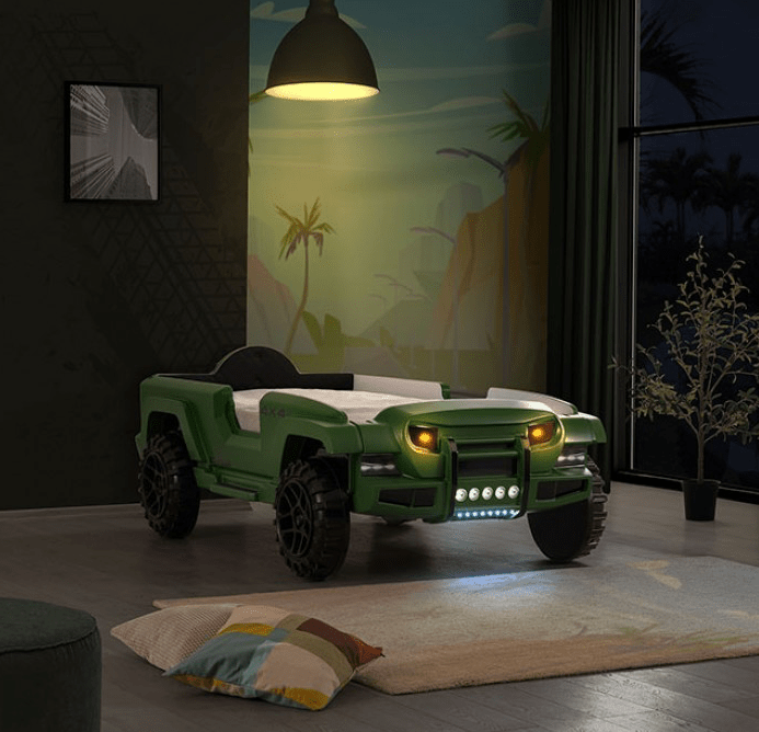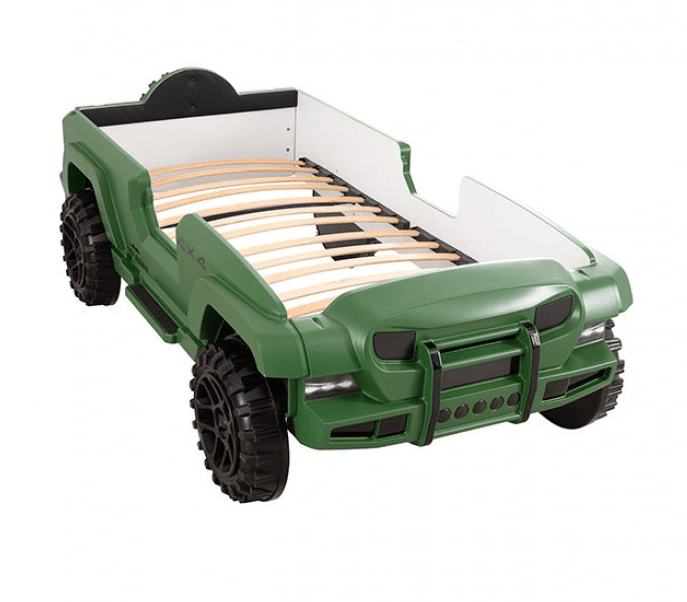 Turn your kids' nighttime routine upside down in a good way with this fun and novel bed! They will love this off-road SUV bed, with awesome features such as bright, remote-controlled lights that glow to the tune of the built-in speakers. The padded leatherette headboard offers safety and comfort, while large replicated tires help fuel their imagination of adventures each and every night.
