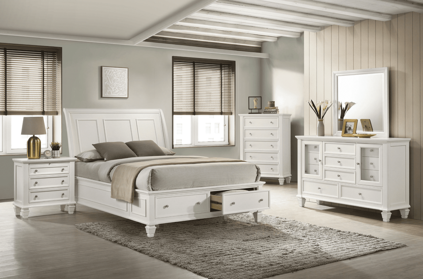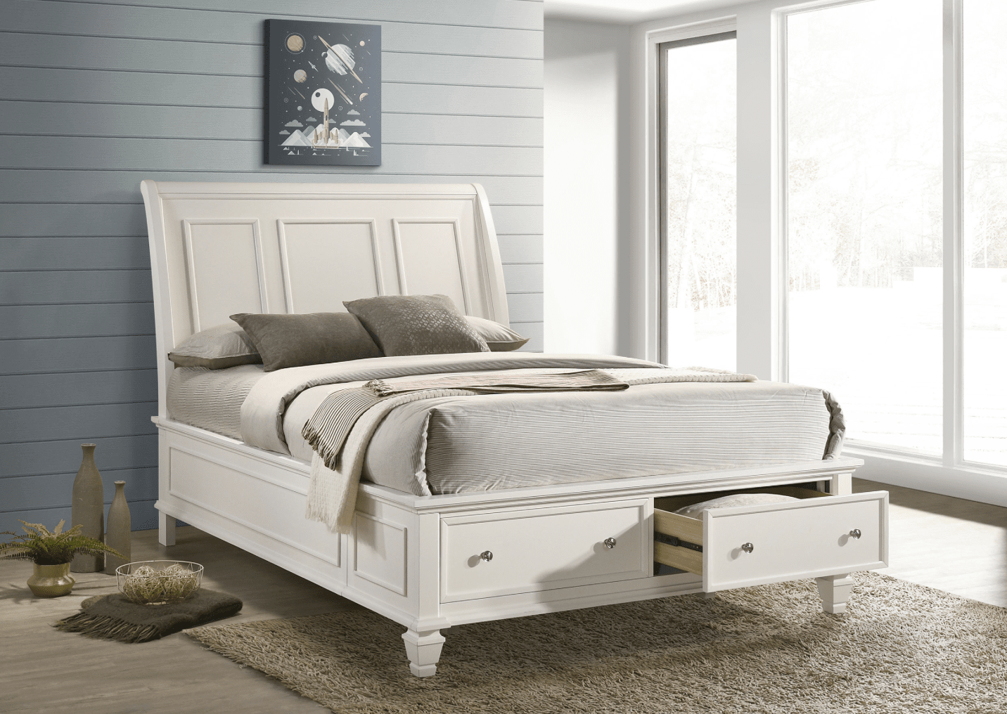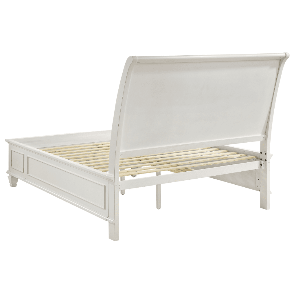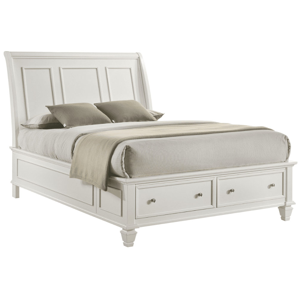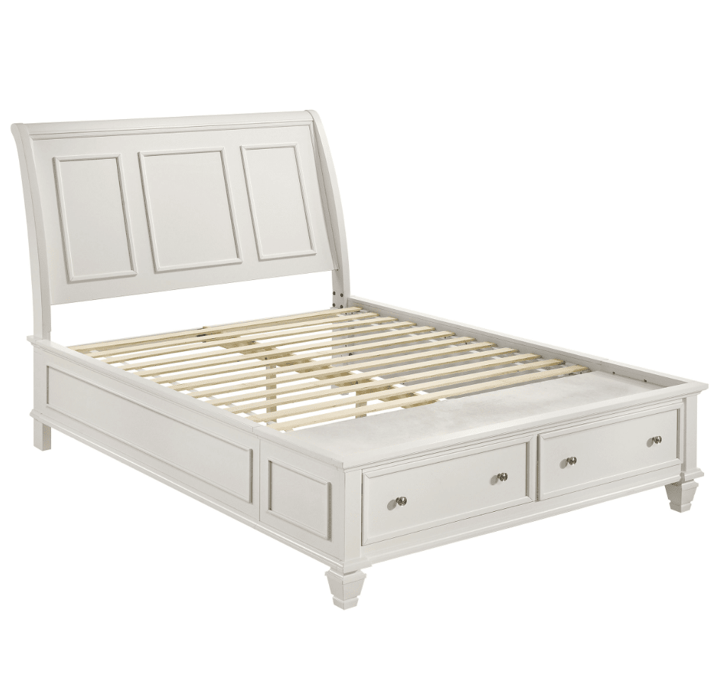 Treat yourself to a restful night's sleep on this sturdy, sophisticated queen bed. Crafted with tropical veneer and hardwoods, it's both durable and glamorous. Available in three classic finishes of cream white, cappuccino, and black, there's an option to fit with most any decor style and color motif. Enhanced by two drawers at the foot of the bed, it offers convenient, space-saving storage. With a stately design and simple silhouette, this queen bed exudes graceful elegance.