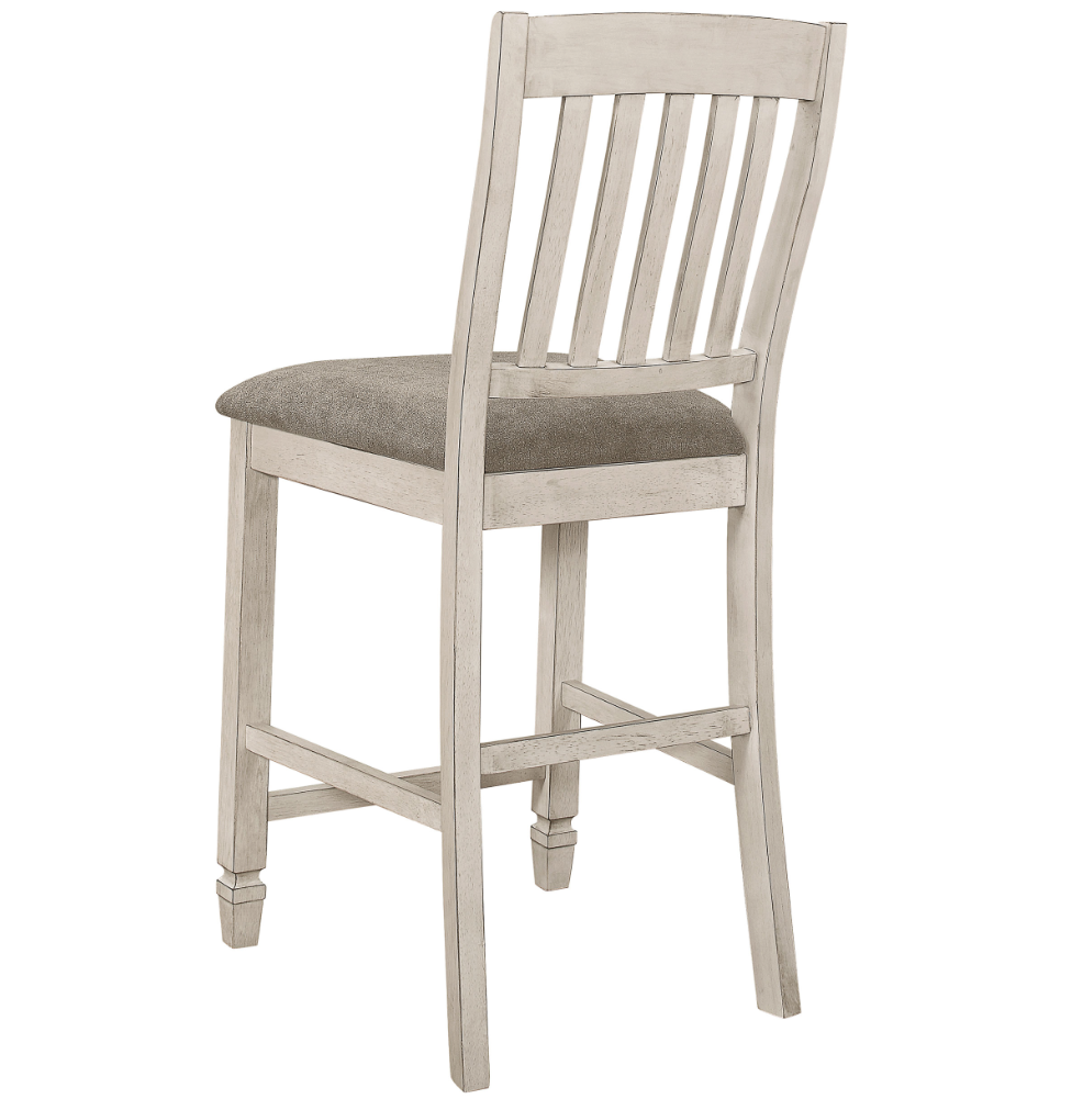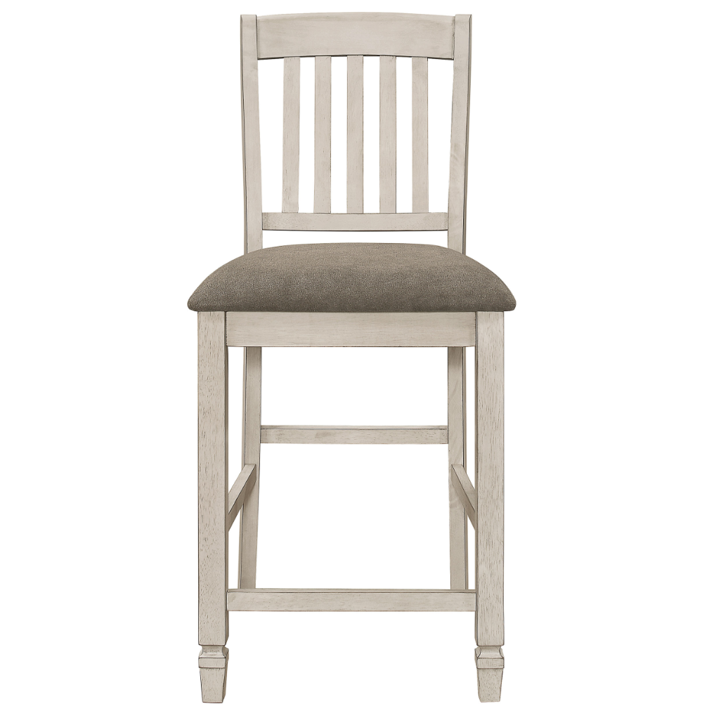 Casual with a transitional style, this five-piece counter height dining set includes a table and four chairs.The dual tone table offers a rustic cream base and is topped with a nutmeg tabletop.Perfect for a modern farmhouse kitchen breakfast nook, this dining table also has four drop leaves that can be raised to support extra dinner guests.In addition, each counter height chair has matching cream wood frame and steam bent curved slats on the backrest, as well as a padded seat cushion with fossil upholstery.For extra storage space, the drop leaf table also has an open lower shelf for storing plates or displaying decor.