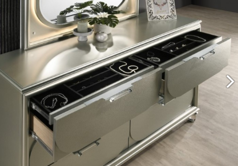 The Sheridan Contemporary King Bedroom Collection boasts a sophisticated modern design, complete with embossed silver panels and clear acrylic legs. Its plush upholstered headboard features a silver LED trim, while the accompanying case pieces offer acrylic handles, feet, and felt lined top drawers. Available in a silver finish, this collection is perfect for adding a touch of elegance to any bedroom.