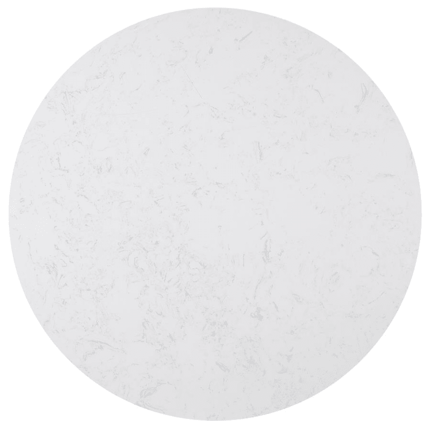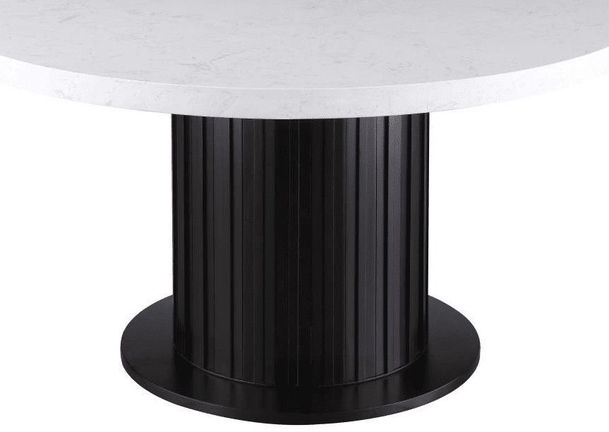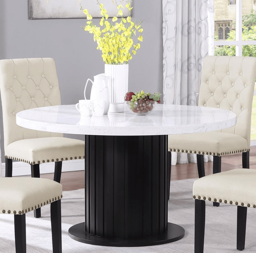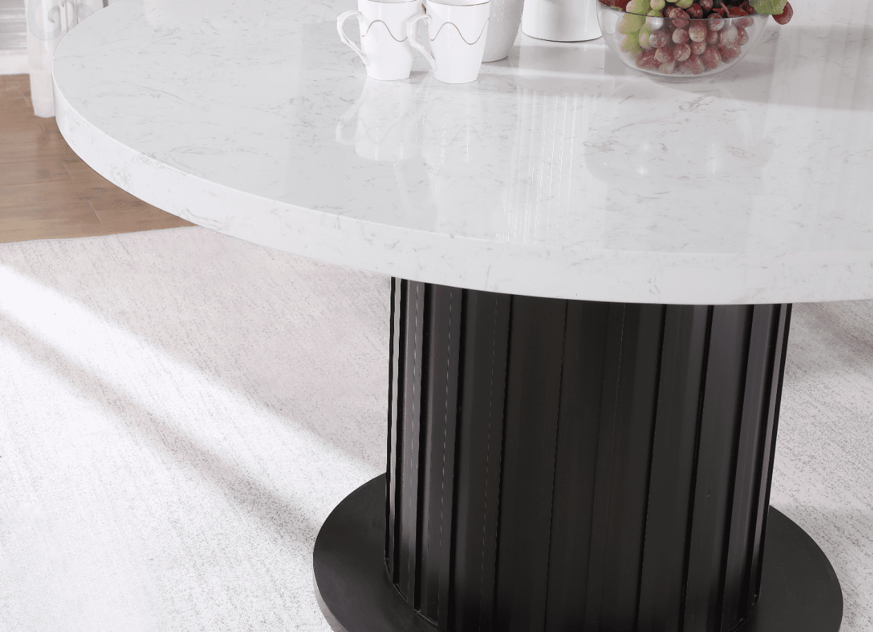Transform a contemporary dining room with this modern, round dining table, designed with a lustrous, white, cultured marble, table top and a rustic espresso finished pedestal base for a contrasting look. Spacious enough to seat four people comfortably, this beautiful dining table features a 54-inch round table top of thick cultured marble that rests on a grounded, round pedestal base, providing a balanced and sophisticated silhouette to dining room spaces.