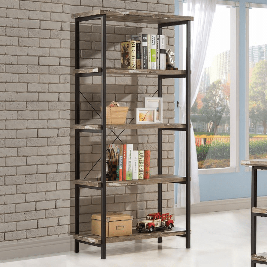 | Rustic industrial bookcase in salvaged cabin with black metal frame boasts clean lines for your modern decor * Four (4) tiers of shelving for a modern arrangement of books or collectibles * Metal, MDF, particle board, and laminate construction * Matches writing desks (#801551, #801235) * Also available in weathered pine |