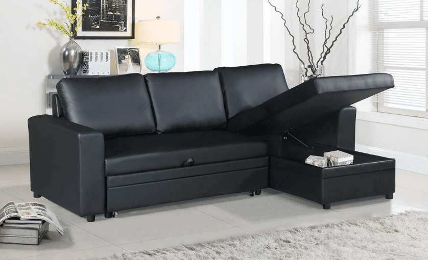 Whether you're entertaining guest or having family stay for a weekend, this compact sectional lets you do both. It features a tightly upholstered fabric with accent stitching. Expand and contract the unit with attached handles. This sectional also includes storage located in the reversible chaise. Available in black (faux leather).