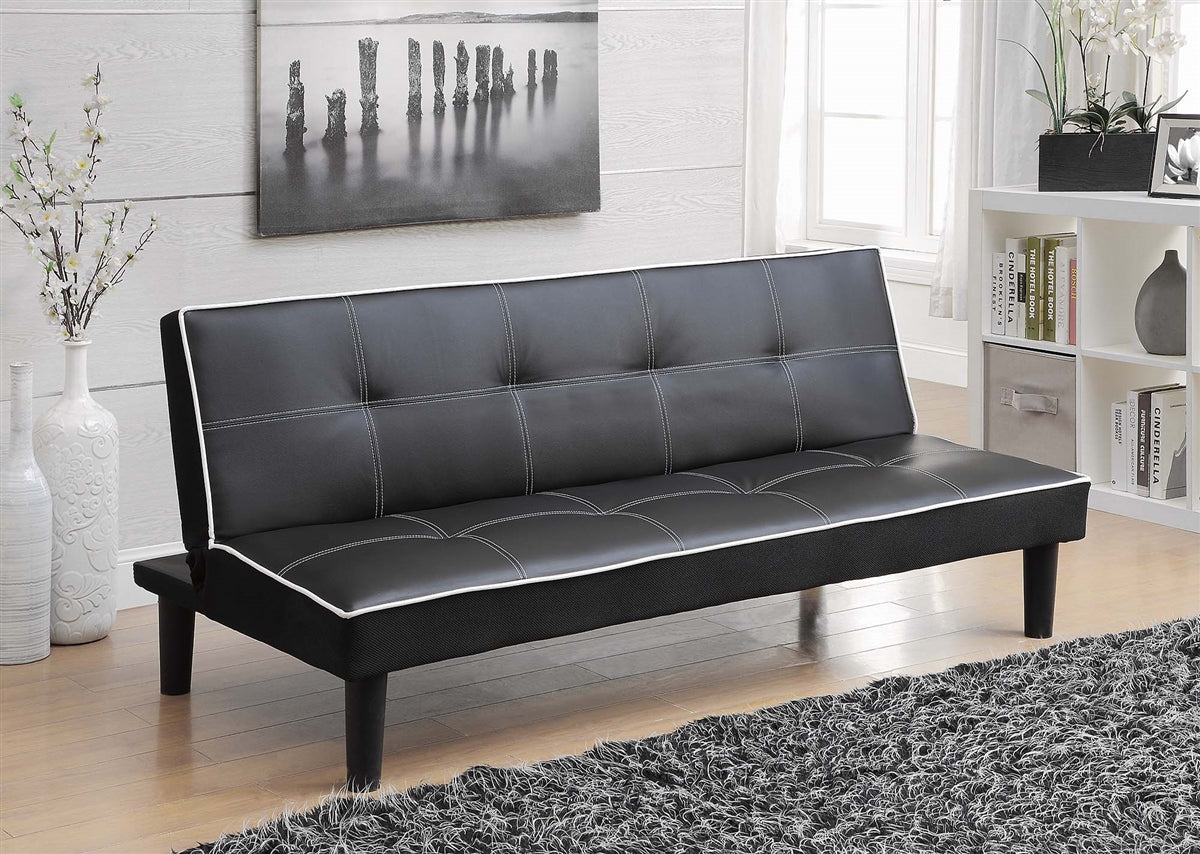Add sleek and versatile structure to any living room with this black sofa bed. Featuring a modern silhouette, the cushions rest on top of a durable kiln dried hardwood frame. The dark leatherette upholstery is given contrast with a lightly hued piping and square-shaped tufting. Designed for comfort, this sofa bed is complete with sinuous spring decking and high-density foam. This sophisticated piece is also available in grey with black piping and brown with tan piping.