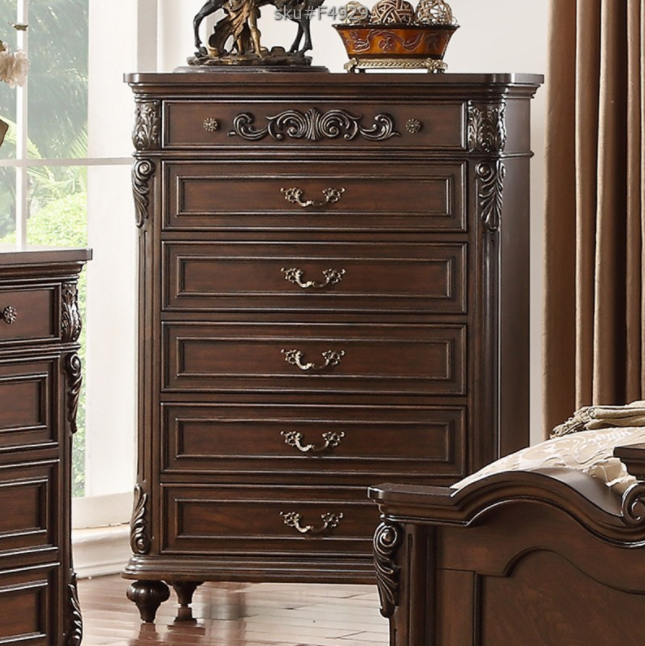 Enhance any bedroom with the Terrell traditional style 6-drawer chest. Crafted from solid wood and finished in brown cherry, it features a floral motif accenting and turned feet for an elegant look. Each of the 6 drawers provide plenty of storage space.