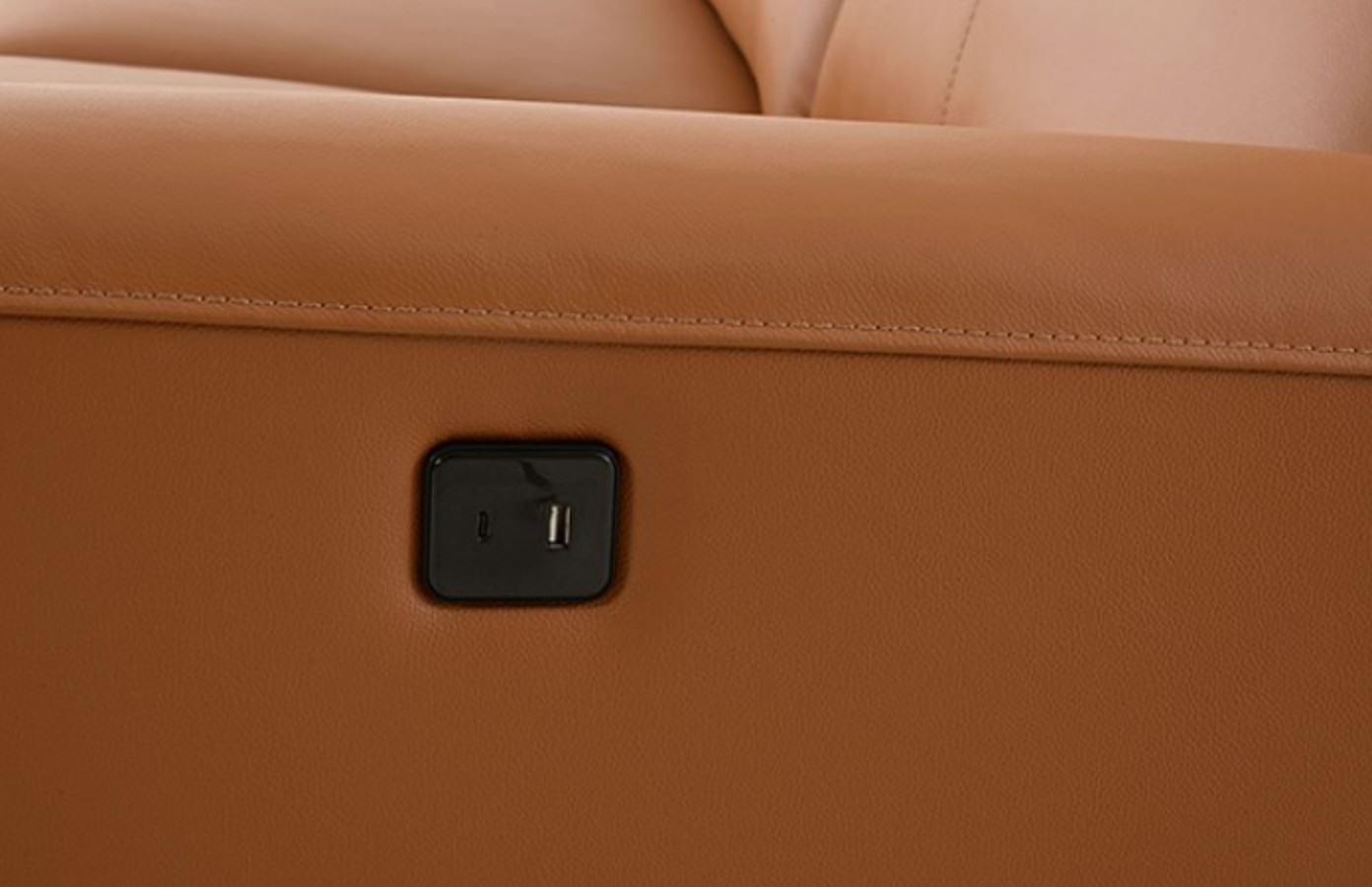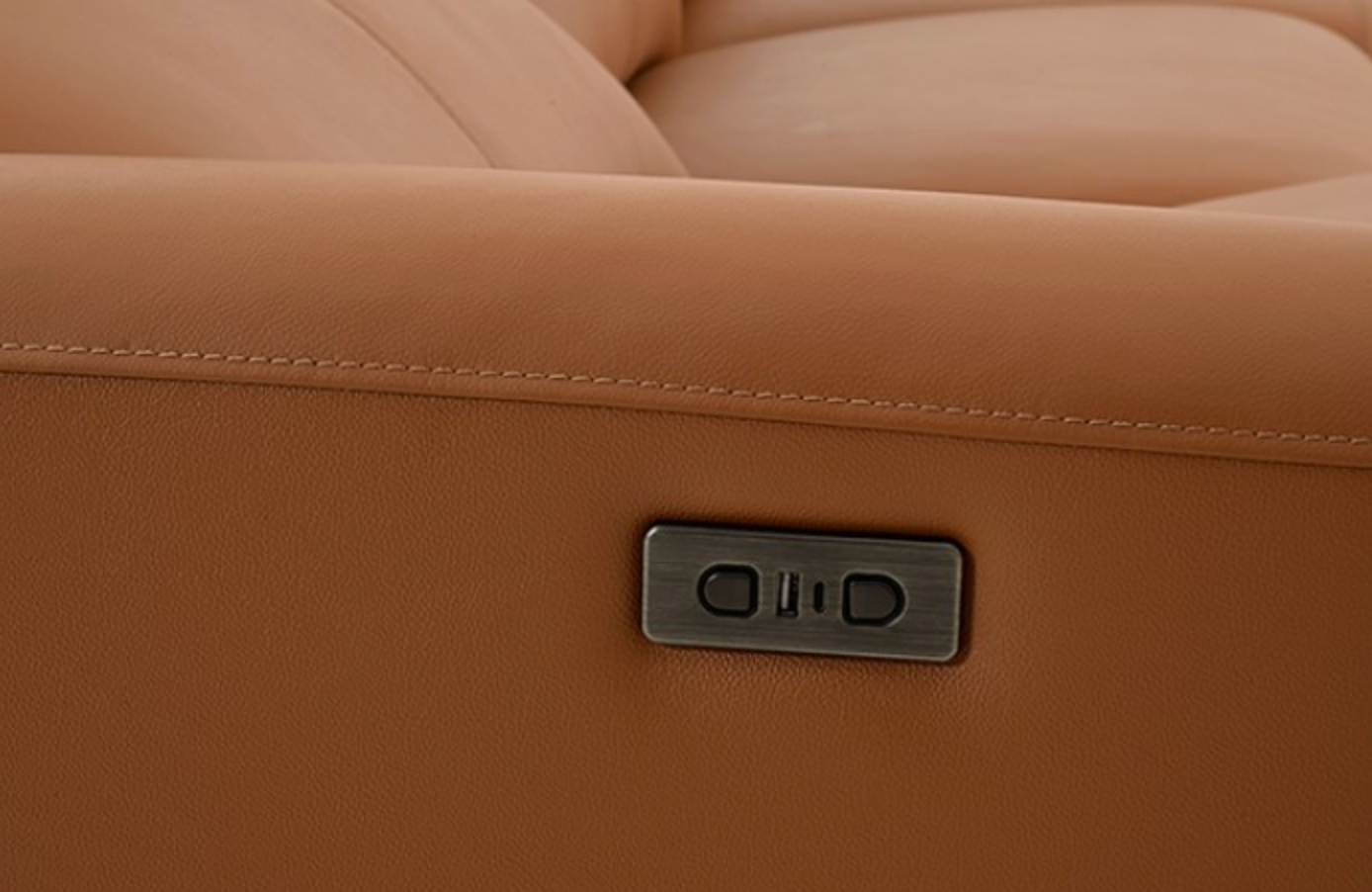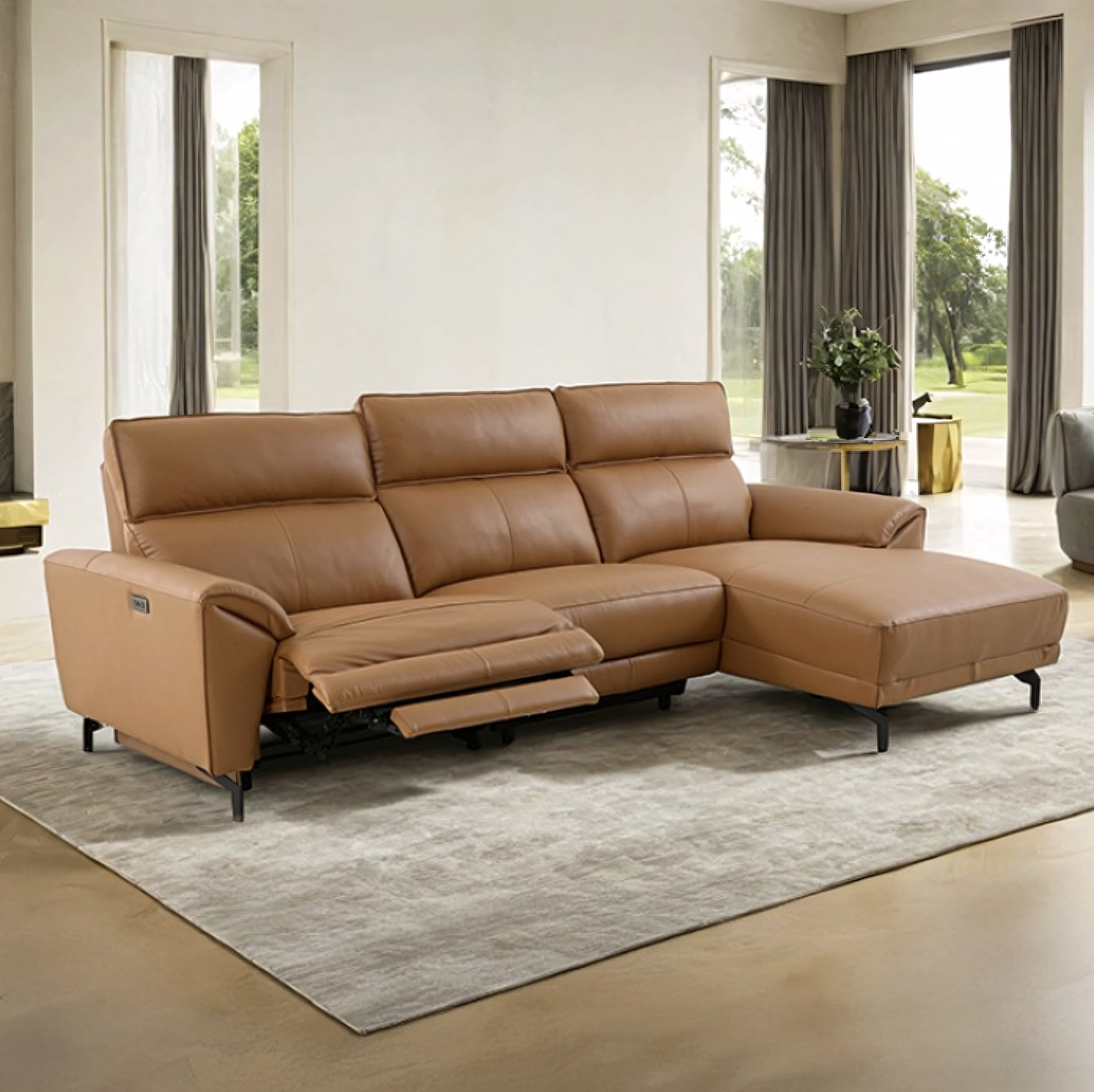 The Themis Sectional combines luxurious top grain leather with bold contemporary design. Upholstered in a warm light brown finish, this oversized sectional features high back cushions, envelope arms with flange accents, and sleek Y-shaped matte black legs. Power recliners with extendable footrests ensure personalized comfort, while built-in USB-A and USB-C ports on both arms keep your devices charged. With its spacious seating and modern styling, the Themis sectional delivers everyday relaxation with designer appeal. Available in multiple chaise orientations and colors to fit your space perfectly.