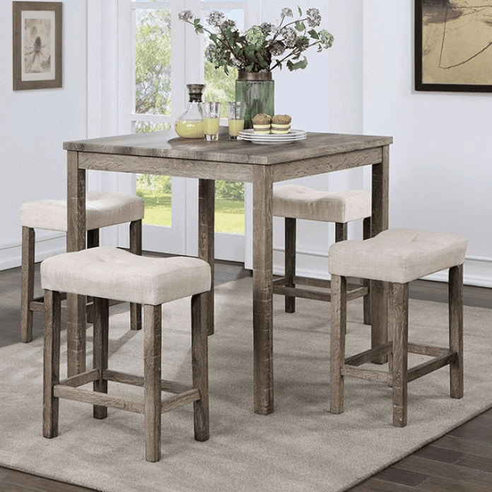 Maybe your goal is to best make use of your dining space? Don't worry, we have you covered. With the Torreon dinette set, the stools stow away easily underneath the table. The saddle seats are upholstered in bright beige linen-like fabric, which complements the gray finish of the table. True to its farmhouse-inspired design, the replicated wood grain on the table top is perfect for any space going for the rustic look.