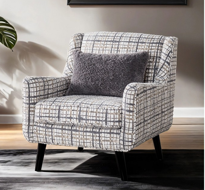 This transitional accent chair combines timeless elegance with modern comfort, making it the perfect addition to any living space. Upholstered in a sleek white and black fabric, it features sloped track arms and a kiln-dried wooden frame for enduring quality. The high-density foam cushions with pocketed coils and reversible seat design ensure lasting comfort, while included decorative pillows add a touch of charm.