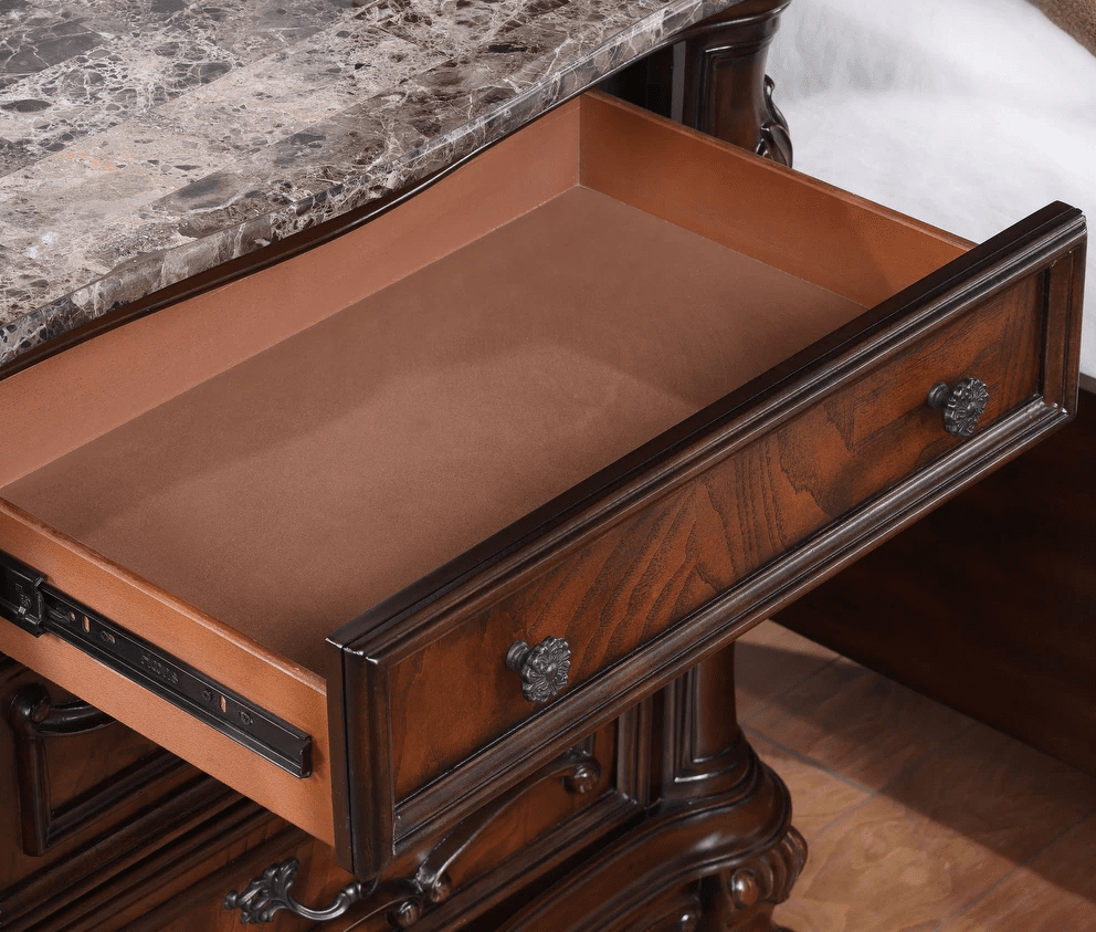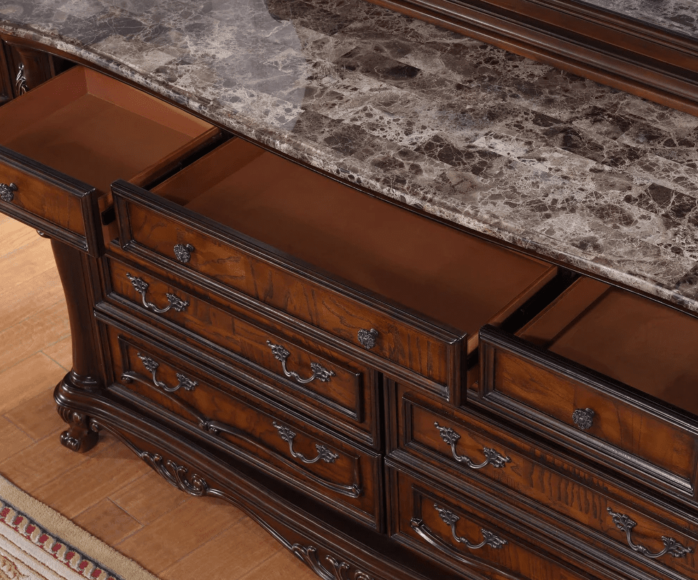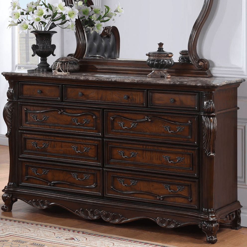 Our traditional 9 drawer dresser in dark cherry features a sintered stone top, premium construction with cedarwood-lined drawers, and felt-lined top drawers. The floral carved details and round knob add an elegant touch. Keep your clothes fresh and organized with this expertly crafted dresser.