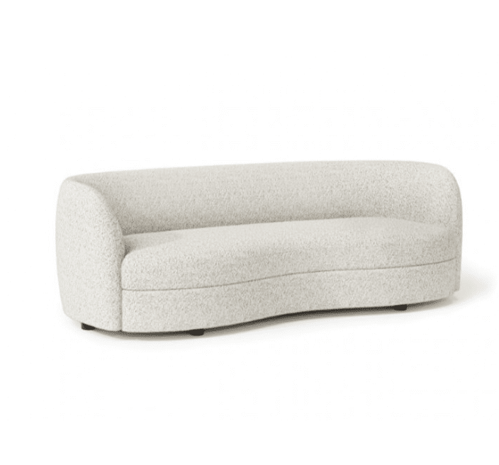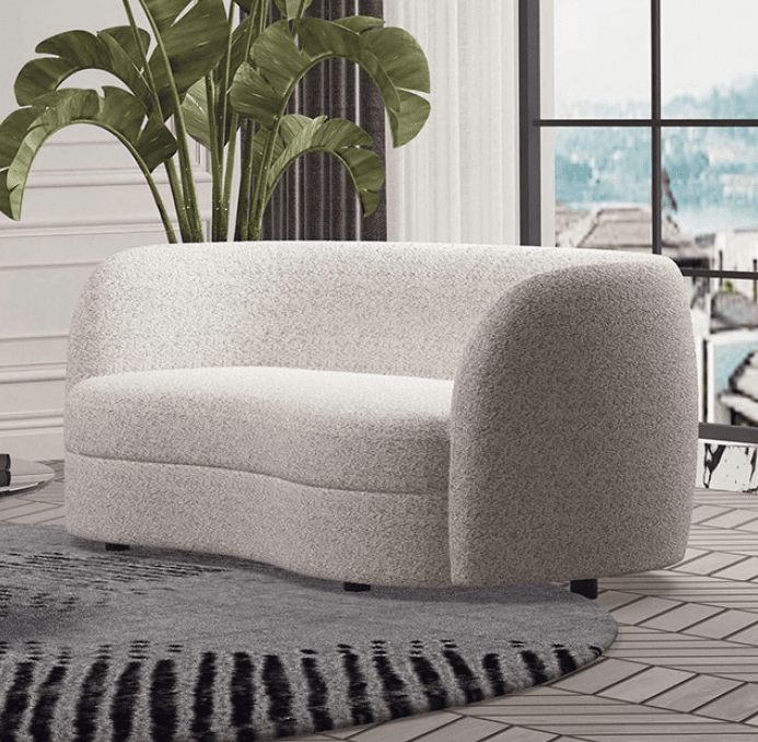 Compact and sculptural, this bouclé sofa and loveseat set brings high style with a snug, ultra-comfortable feel. Each piece features a fitted kidney-shaped single cushion, gently curved arms and backrest, and barely-there wooden legs for a modern, floating look. Beyond the intriguing shape, the exclusive bouclé fabric adds visual impact with subtle metallic undertones that shimmer under certain lighting—creating an undeniably chic centerpiece for any contemporary space.