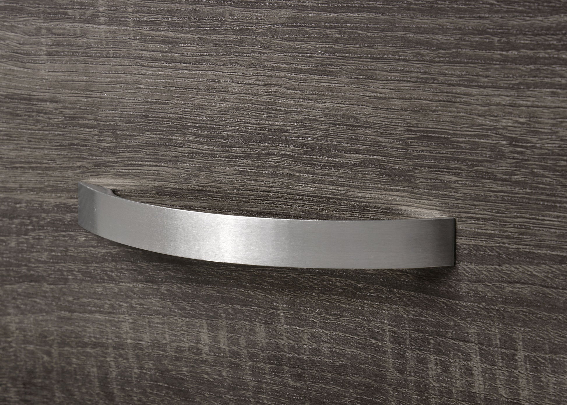 - Nickel-finished half-moon pulls provide a contemporary accent