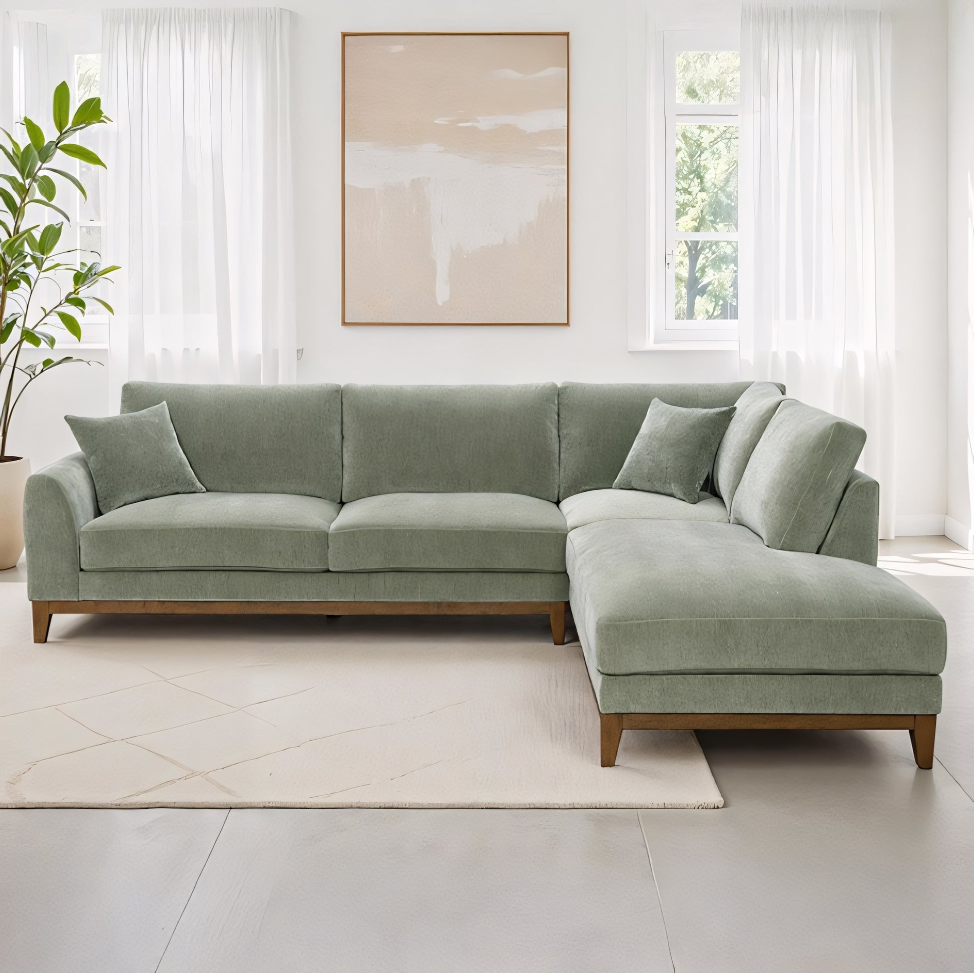 Watton Mid-Century Modern Olive Green Chenille Sectional Sofa with Walnut Wood Trim