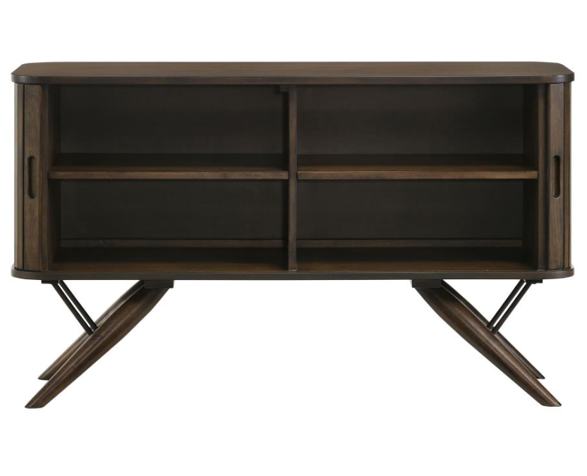 Elevate your dining area with this mid-century modern server. Beautifully designed with campaign style influences, this contemporary server rests on striking flared legs that offer a retro-inspired aesthetic. Tambour doors with finger-tip pulls bring out a nautical expression and a vintage touch. Open the cabinet doors and you will find ample space for all your dishes, stemware, and more. A rich, dark walnut finish brings out charming details.