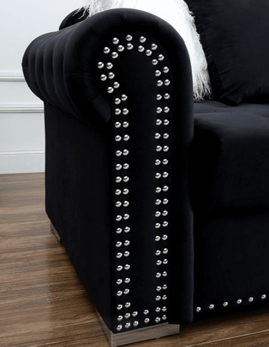Luxury and comfort are the cornerstones of this sectional. There's a spectacular feel to the soft velvet-like fabric that wraps the whole piece, accentuated by button tufting all around. Although clearly inspired by the traditional chesterfield sofa, details like nailhead trim, chrome bracket feet, and attached chaise set it apart.