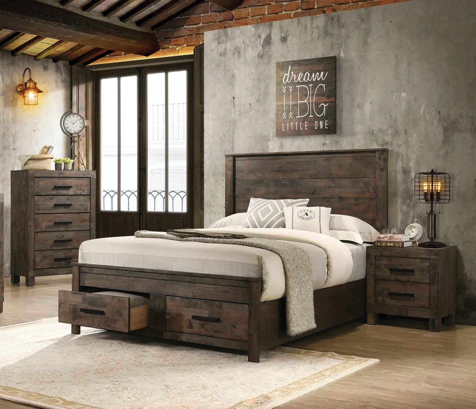 Bring a warm blend of classic craftsmanship and modern convenience to your bedroom with this transitional storage bed. An imposing headboard anchors the room, while a platform base with a storage footboard keeps essentials neatly tucked away. Finished in a full matte rustic golden brown with wire-brushed grain, the bed delivers cozy countryside allure. Solid block legs and wooden pull handles complete the timeless look.